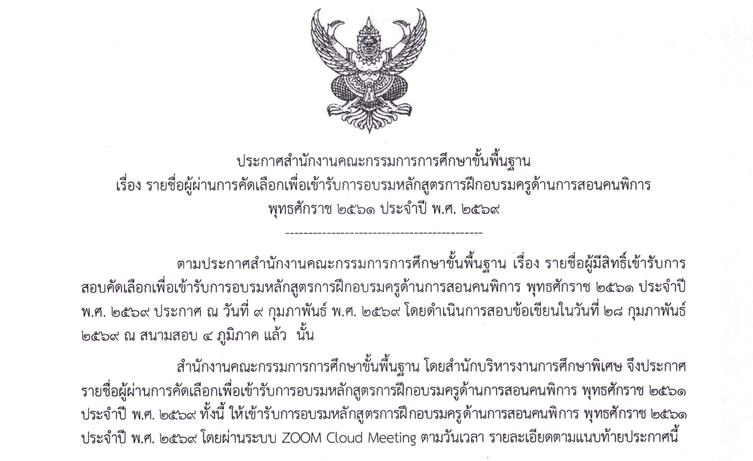 ประกาศสำนักงานคณะกรรมการการศึกษาขั้นพื้นฐาน เรื่องรายชื่อผู้ผ่านการคัดเลือกเพื่อเข้ารับการอบรมหลักสูตรการฝึกอบรมครูด้านการสอนคนพิการ พุทธศักราช 2561 ประจำปี พ.ศ. 2569 ดาวน์โหลดประกาศรายชื่อ