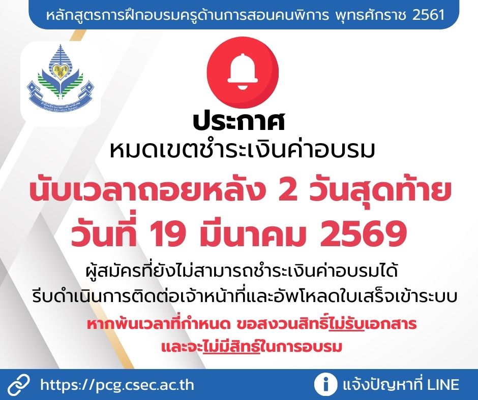 หมดเขตชำระเงินค่าอบรม นับเวลาถอยหลัง 2 วันสุดท้าย วันที่ 19 มีนาคม 2569 ผู้สมัครที่ยังไม่สามารถชำระเงินค่าอบรมได้ รีบดำเนินการติดต่อเจ้าหน้าที่และอัพโหลดใบเสร็จเข้าระบบ